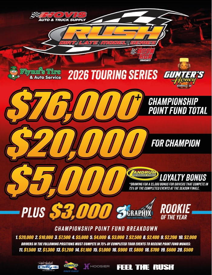 (Pulaski, PA)…The Hovis Auto & Truck Supply RUSH Late Model Series presented by Born2Run Lubricants is proud to release its powerful 2026 Flynn’s Tire/Gunter’s Honey Touring Series schedule of events. The richest season in Series history will include a minimum of 20 events at 12 different speedways all paying between $4,000 and $20,000 to-win, and boasting a $76,200 point fund with $20,000 to the champion! Six of the events will pay more than the standard $4,000 to-win purse. Many of the events will be streamed live by FloRacing, DIRTVision, The Cushion, and Dirt.tv. Jeremy Wonderling is the defending Series champion and has won five of the last eight titles.